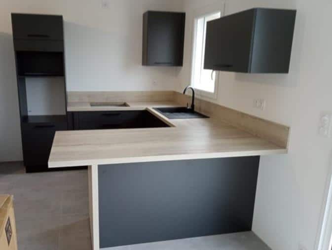 Cette cuisine en U allie élégance et fonctionnalité dans un espace optimisé, parfait pour une utilisation quotidienne et des moments de convivialité. La couleur sombre des meubles bas crée un contraste saisissant avec le plan de travail en bois clair, apportant à la fois modernité et chaleur à l’ensemble. L’organisation en U permet une circulation fluide tout en offrant de nombreuses zones de rangement et de travail.