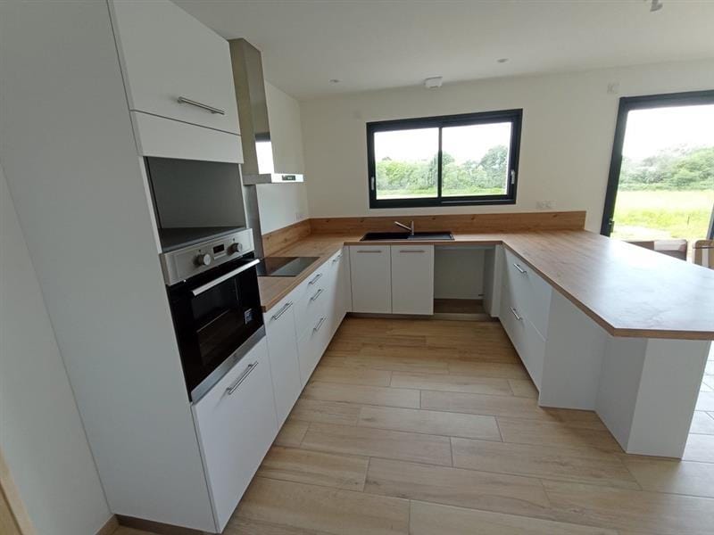 Pour cette cuisine en forme de U installée au Bignon, nous avons un agencement qui allie praticité, modernité et confort d’utilisation, tout en optimisant l’espace disponible. Ce modèle est conçu pour les amateurs de cuisine qui recherchent un environnement fluide, ergonomique et convivial, avec un espace de préparation généreux et des finitions de qualité.