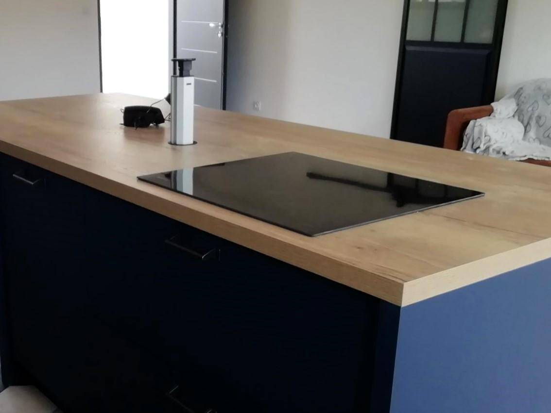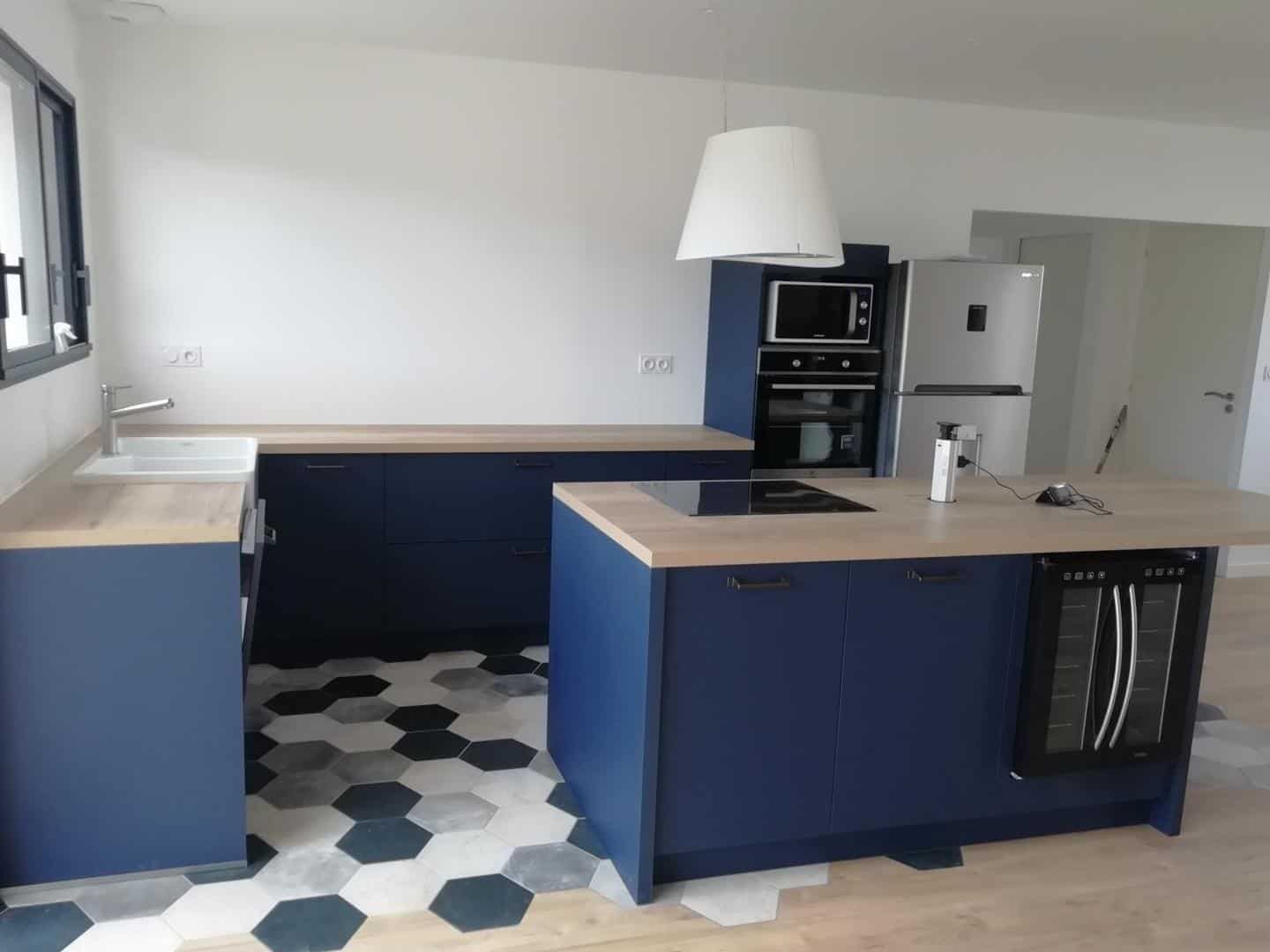 Tout d’abord, l’îlot central est l’élément phare de cette cuisine. Il joue un rôle central, à la fois pratique et esthétique. La grande surface du plan de travail offre non seulement un espace de préparation généreux, mais permet aussi d’accueillir des repas rapides ou de servir de bar pour des moments conviviaux. La finition en bois de l’îlot ajoute une dimension naturelle et chaleureuse à l’ensemble, contrastant parfaitement avec les façades bleues élégantes des meubles de cuisine. Ce contraste donne du caractère à l’espace tout en conservant une harmonie générale avec le reste de la pièce. En outre, l’îlot intègre subtilement une cave à vin, idéale pour les amateurs de vin qui souhaitent avoir leurs bouteilles préférées à portée de main lors des repas.