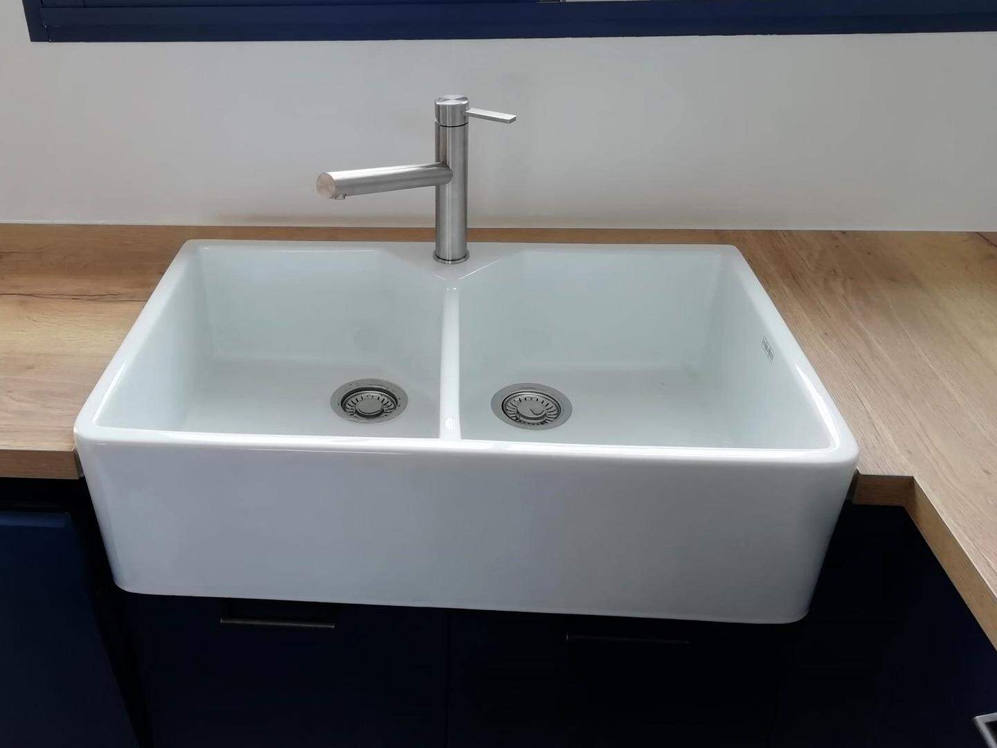 L’évier, quant à lui, est une pièce maîtresse dans l’agencement. Il s’agit d’un évier de style « farmhouse » ou timbre d’office, en céramique blanche, qui allie à la fois tradition et modernité. Son design à double bac est à la fois pratique et esthétiquement plaisant. Le grand bac permet une utilisation aisée pour laver même les plus grands ustensiles de cuisine ou plats de cuisson, tout en restant en accord avec le style épuré et fonctionnel de la cuisine. L’évier est mis en valeur par un mitigeur en inox brossé, simple et efficace, qui complète à merveille l’esthétique minimaliste de cette cuisine.