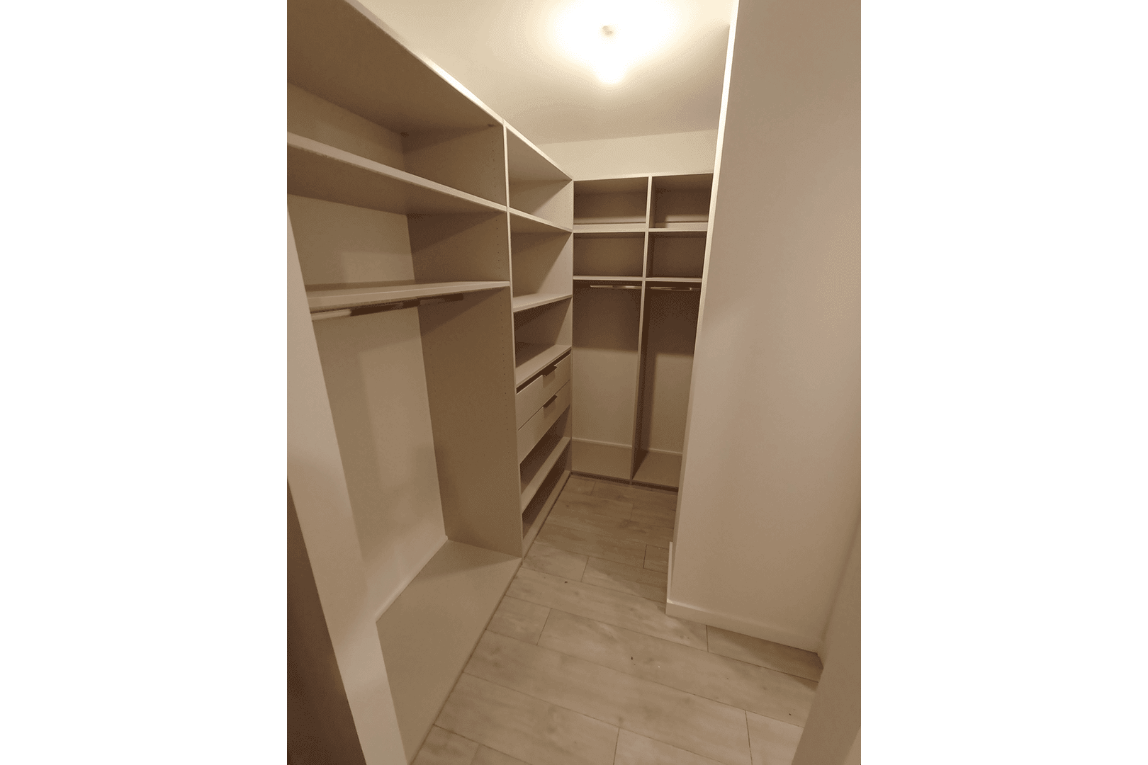 Ce dressing en L pour une chambre parentale est l’exemple parfait d’un agencement élégant et fonctionnel, conçu pour maximiser l’espace de rangement tout en apportant une touche de caractère à la pièce. La configuration en L offre une optimisation totale de l’espace disponible, permettant de multiplier les étagères et les compartiments. Grâce à son vaste espace, il permet un rangement méthodique de toutes les affaires du couple, des vêtements aux accessoires, tout en les rendant facilement accessibles.
