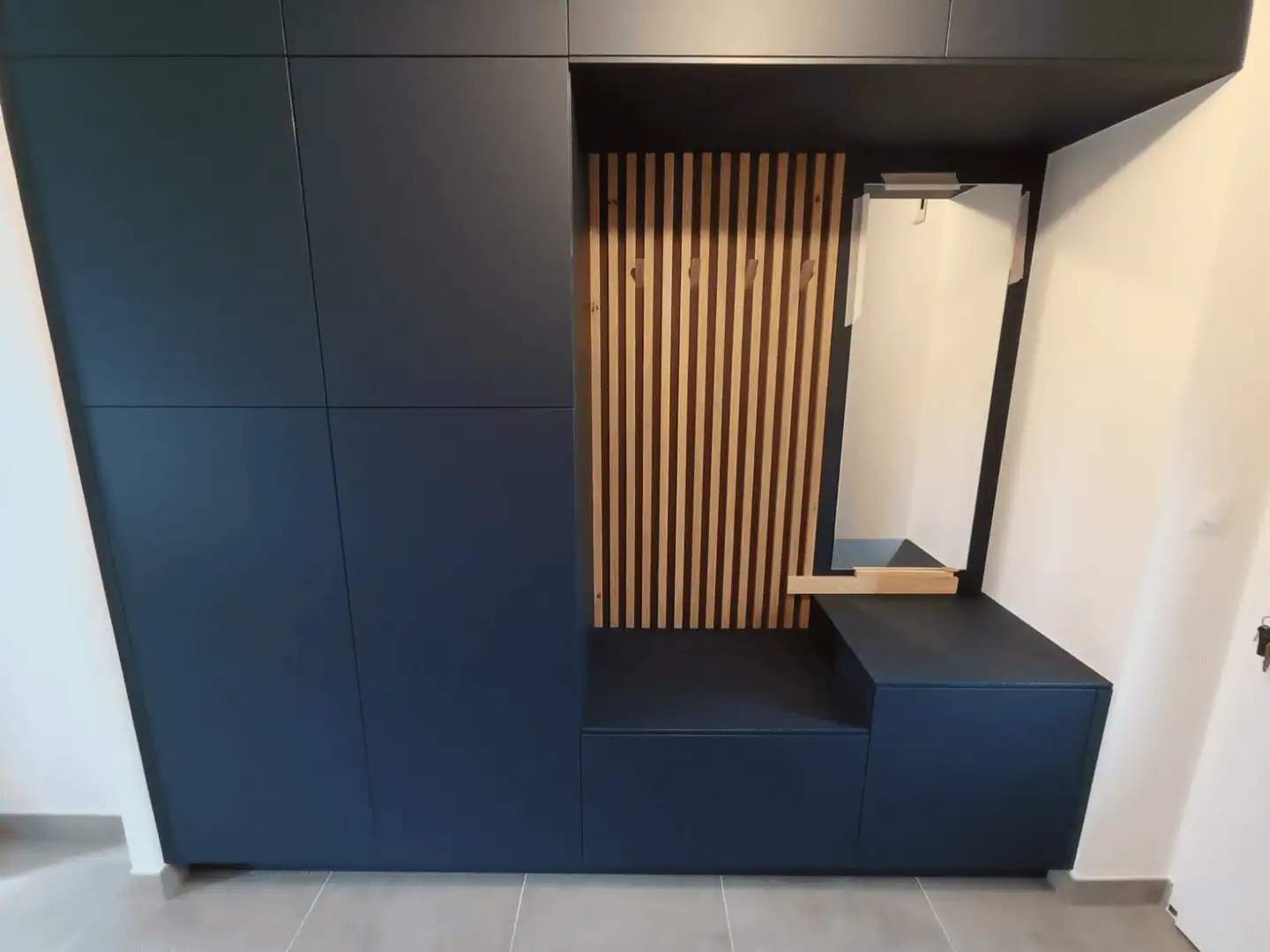 Au-delà de son aspect visuel, cet ensemble propose une solution ingénieuse pour optimiser le rangement dans l’entrée. Grâce à ses armoires fermées, il permet de dissimuler les manteaux, chaussures et autres objets du quotidien, offrant ainsi un espace toujours rangé et dégagé. Le banc intégré, en plus de servir de rangement, constitue une assise pratique pour se chausser ou se déchausser. Les patères en bois, discrètement intégrées dans le design, sont un atout pratique pour accrocher des vestes ou sacs, sans encombrer visuellement l’espace.