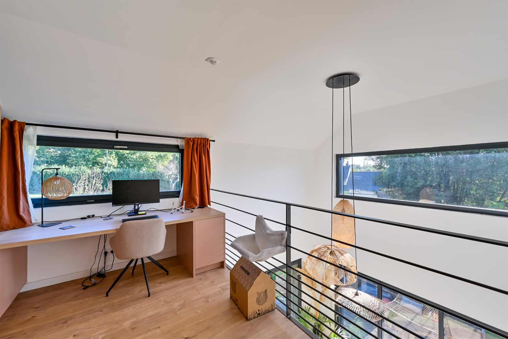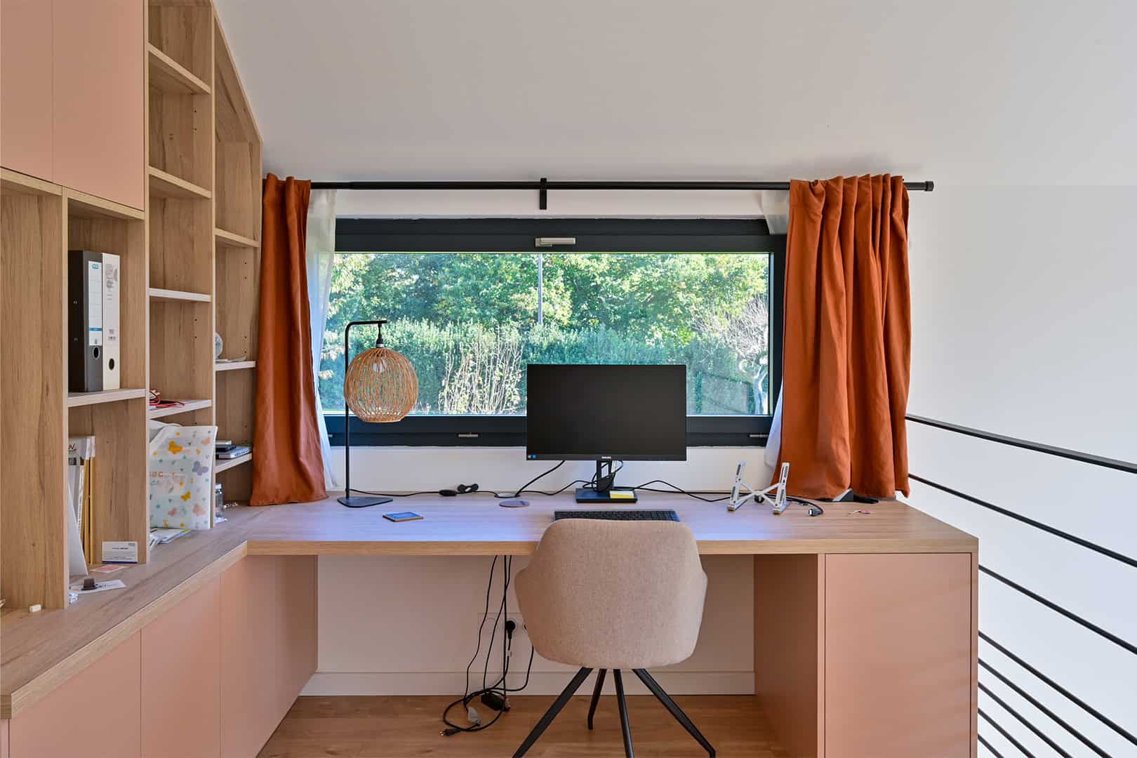 Cet aménagement de bureau sur mesure est donc la solution parfaite pour ceux qui souhaitent un espace de travail confortable, organisé et en harmonie avec la nature environnante. Il est l’exemple de ce que peut offrir un expert en agencement en termes d’optimisation des espaces et d’intégration esthétique dans l’architecture existante.