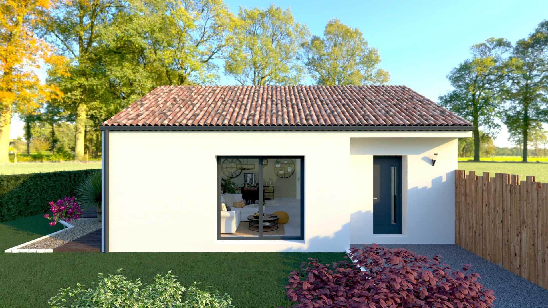 Maison : Plain-pied – pièce à vivre de 40 m² – 2 chambres – une salle de bains – un wc séparé – un cellier – une entrée