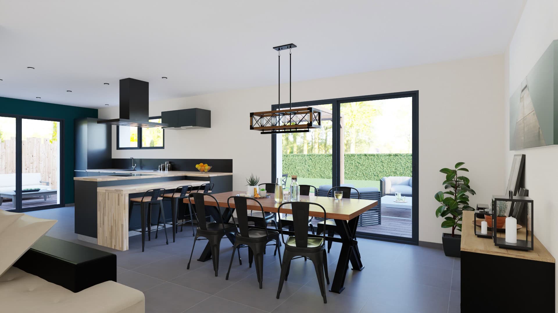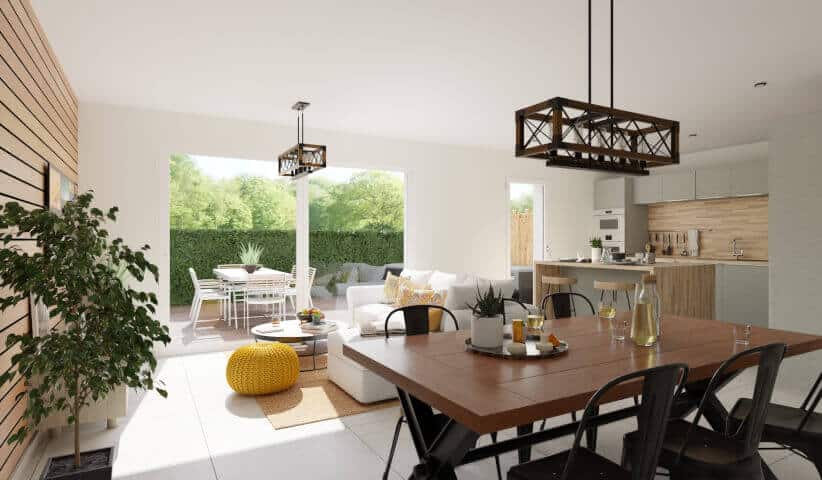 Offrez-vous cette charmante maison de 90 m² + 18 m² de garage ! Idéale pour un premier projet, cette maison conçue de plain-pied vous apportera confort et convivialité. Elle comprend : – un séjour de plus de 42 m² Bardé de grandes ouvertures, il vous offrira beaucoup de luminosité et un magnifique panorama sur l’extérieur. Sa cuisine ouverte sur la salle à manger et le salon vous permettra de recevoir famille et amis dans un esprit convivial. – 3 Chambres de plus de 10 m² avec espace placard (dont une avec dressing) – Une salle de bains (espace suffisant pour une baignoire et une double vasque) – Une entrée avec espace placard et wc séparés. Evolutive, nous adapterons cette maison selon vos besoins.
