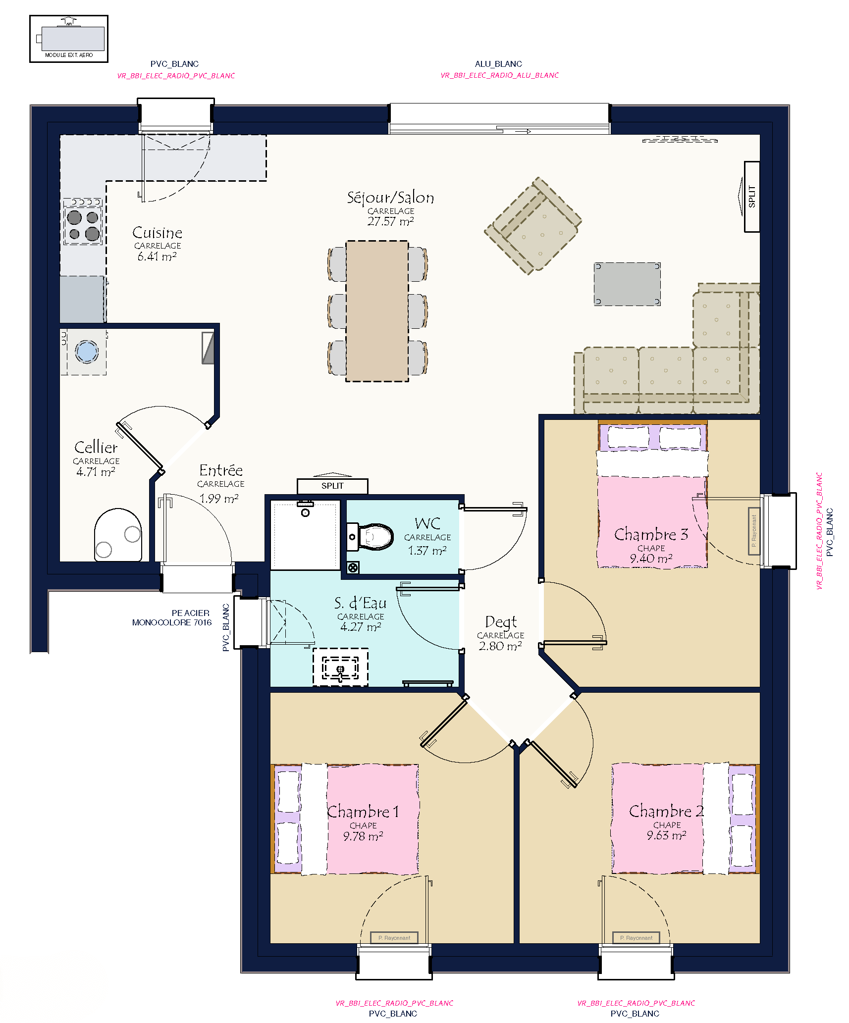 Cette maison de 78m2 se compose d’une pièce de vie de 34m2, 1 cellier,3 belles chambres et 1 salle de bain.