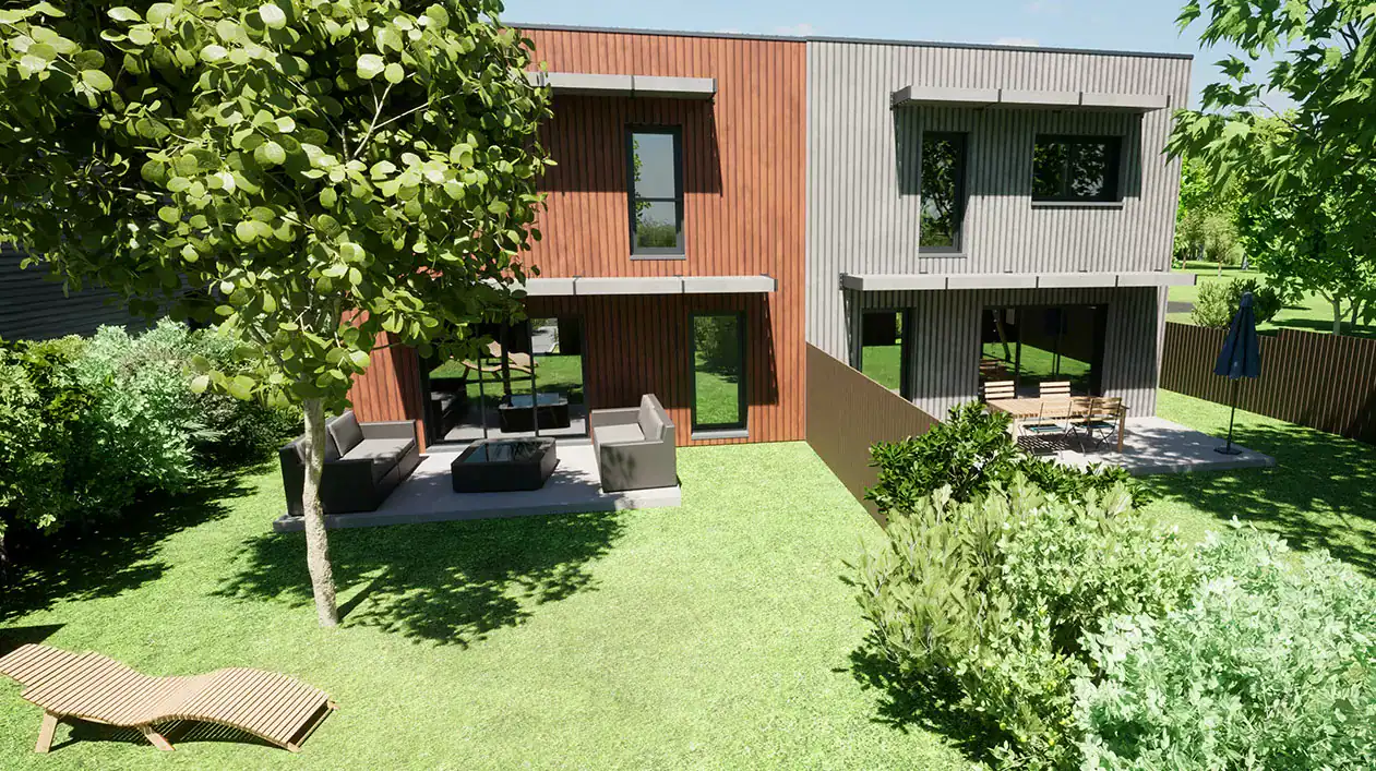 Les maisons sont équipées de brise-soleil composés de lames sur supports métalliques intégrant une marquise en acier en couverture sur les portes d’entrées. L’habillage des façades est réalisé en bois autoclave grisé avec une alternance de poses horizontales et verticales pour donner à ces maisons une allure contemporaine.